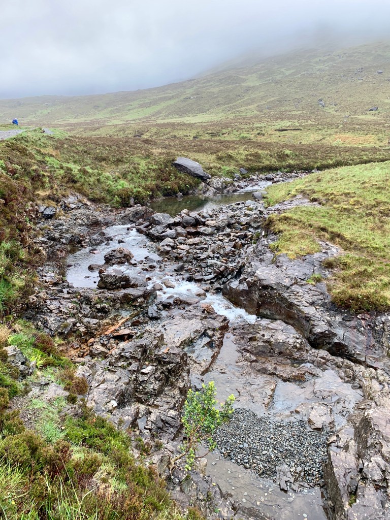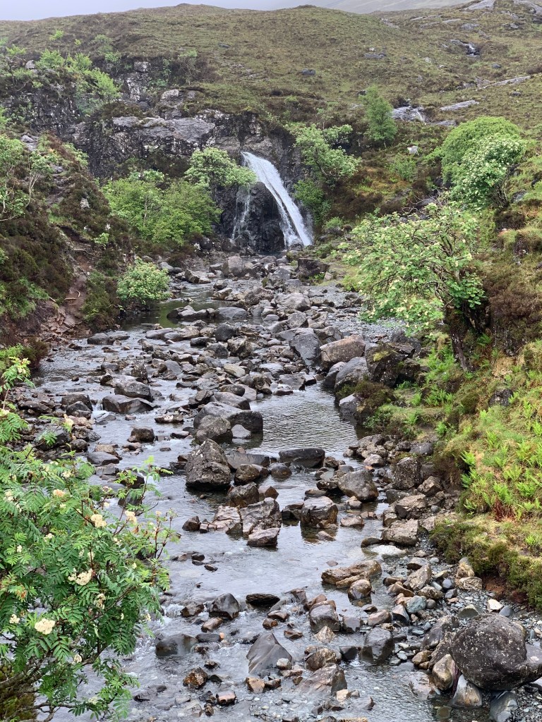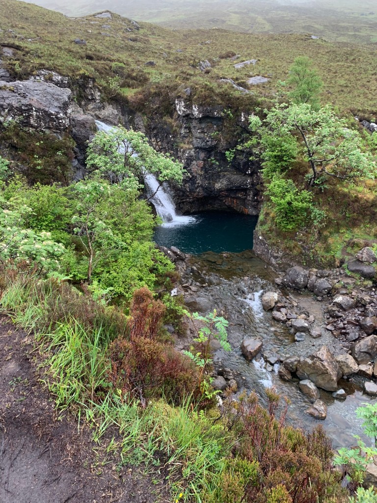 The Fairy Pools are near an area called Glen Brittle and you’ll have to take small, off-the-beaten-path roads to get there from Uig and some of the roads were nothing more than gravel trails, so again, make sure the weather will support the drive or have a vehicle that you’re not going to get stuck in. The pools have a designated parking lot which makes it accessible and easy to find. From the car park, it takes about forty five min to an hour to hike back into the hills before you begin seeing the largest of the pools. It’s not a difficult hike by any means, but was muddy and slippery when we went as it had poured shortly before we arrived. The pools themselves are beautiful and the water is turquoise blue when the sun hits it. The water has eroded out the terrain where it flows making for some fascinating formations and photo ops. NOTE: there were small gnats flying around everywhere making it difficult to even breath. I had to wrap my scarf around my face to keep myself from inhaling them. After snapping some photos of the pools we were pretty wet and cold from hiking around so we made our way back to the car and headed back to Portree to grab some fish and chips along the harbor and taking our last stroll through Portree before turning in for our last evening there.