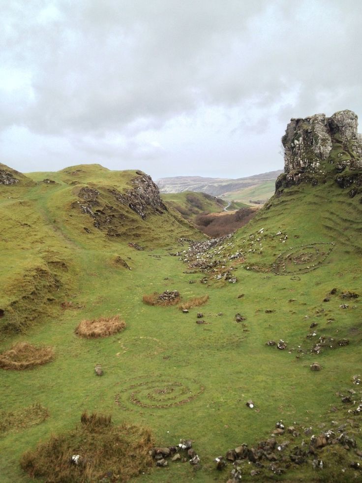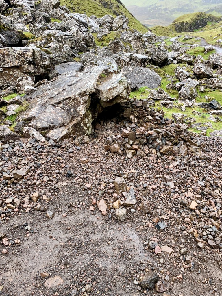 The cloud cover broke up a bit as the day progressed and when we had finally parked along the road to hike Quiraing, we had some moments of stunning blue skies and nothing but rolling green everywhere we looked. The hike itself is mild and accessible for nearly all ages although letting others pass on the narrow path can be a bit tricky at times. There are two notable rock formations: The Prison and The Needle. The prison is a pyramidal shaped formation that, when viewed from the right angle, looks like a medieval keep. The Needle is a jagged 120ft high point that is a remnant of land-slipping. The change in terrain on this hike is interesting as you climb and we it was as if we went from the Shire to Mordor along the short hike. (Yes, that’s a Lord of the Rings reference). The terrain changes from grassy slopes to a rocky quarry when you reach “the bowl”. There was a man made shelter at the top, although no clue of how long it had been there or who made it. The hike continued further than we went and you have to hop over a break in a barbed wire fence to continue along the path so we decided to stop our hike there and return back to the car to go check out the Fairy Glen and Fairy Pools.
