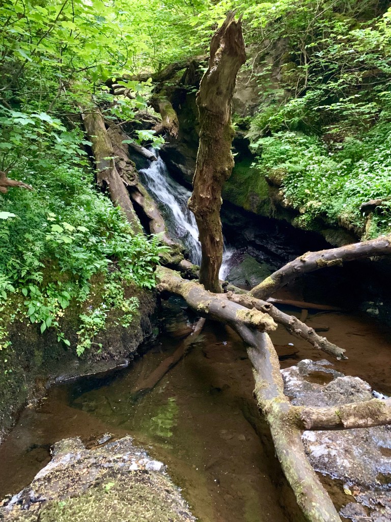 The fish and chips from the shop along the Portree harbor were some of the best we had during our trip and they’re served wrapped in a brown paper parchment that locks in all the delicious aroma and flavor! We found a small alcove that was shielded from the drizzle and devoured our fish and chips while sipping on some Tennent’s beers. After eating we had just enough time for one last stroll through Portree before sunset and we stumbled upon what we’re calling “the Portree Waterfall”. The waterfall is just a short, 5-10 minute walk outside of Portree and if fairies existed, they’d live here. It was such a magical little find.