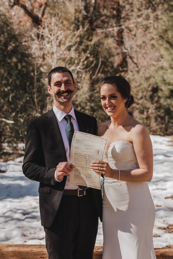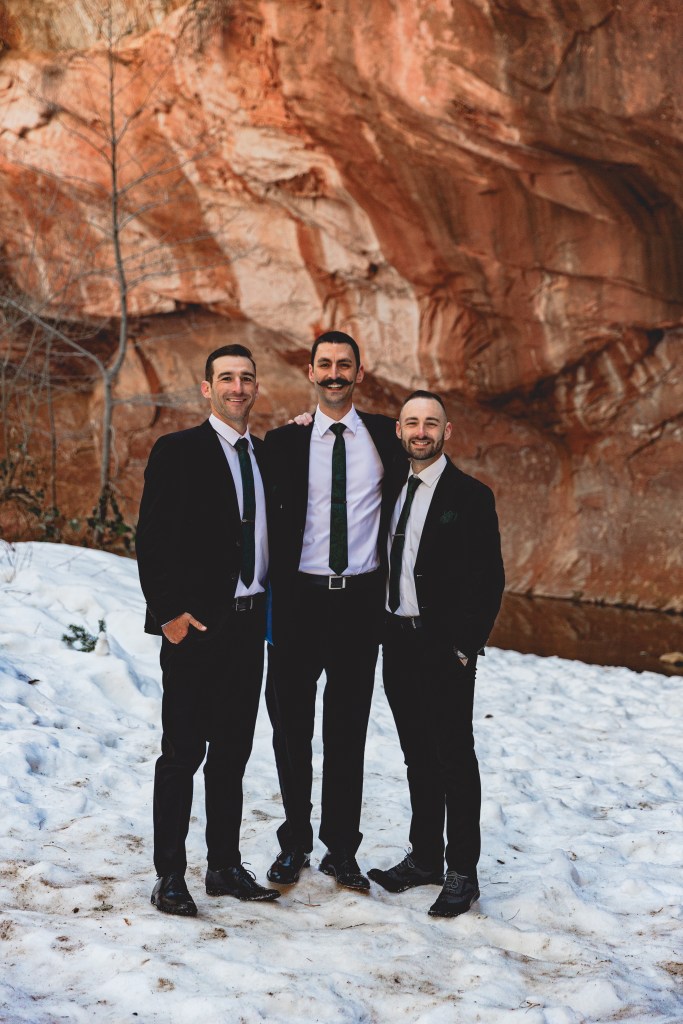 It was a whopping 26*F on the morning of the wedding and when we got to the trailhead, there was already snow on the ground and we hadn’t even walked back into the canyon yet. Thankfully we chose a rather flat, easy trail – minus a few creek crossings – so everyone was able to do it in tennis shoes that we all just changed out of before the ceremony. In total the ceremony took about 15-20 minutes but nearly 3 hours of photos and video clips. I’d say it was all worth it.