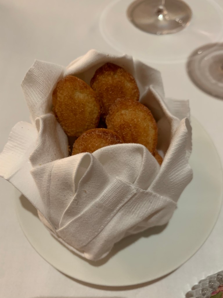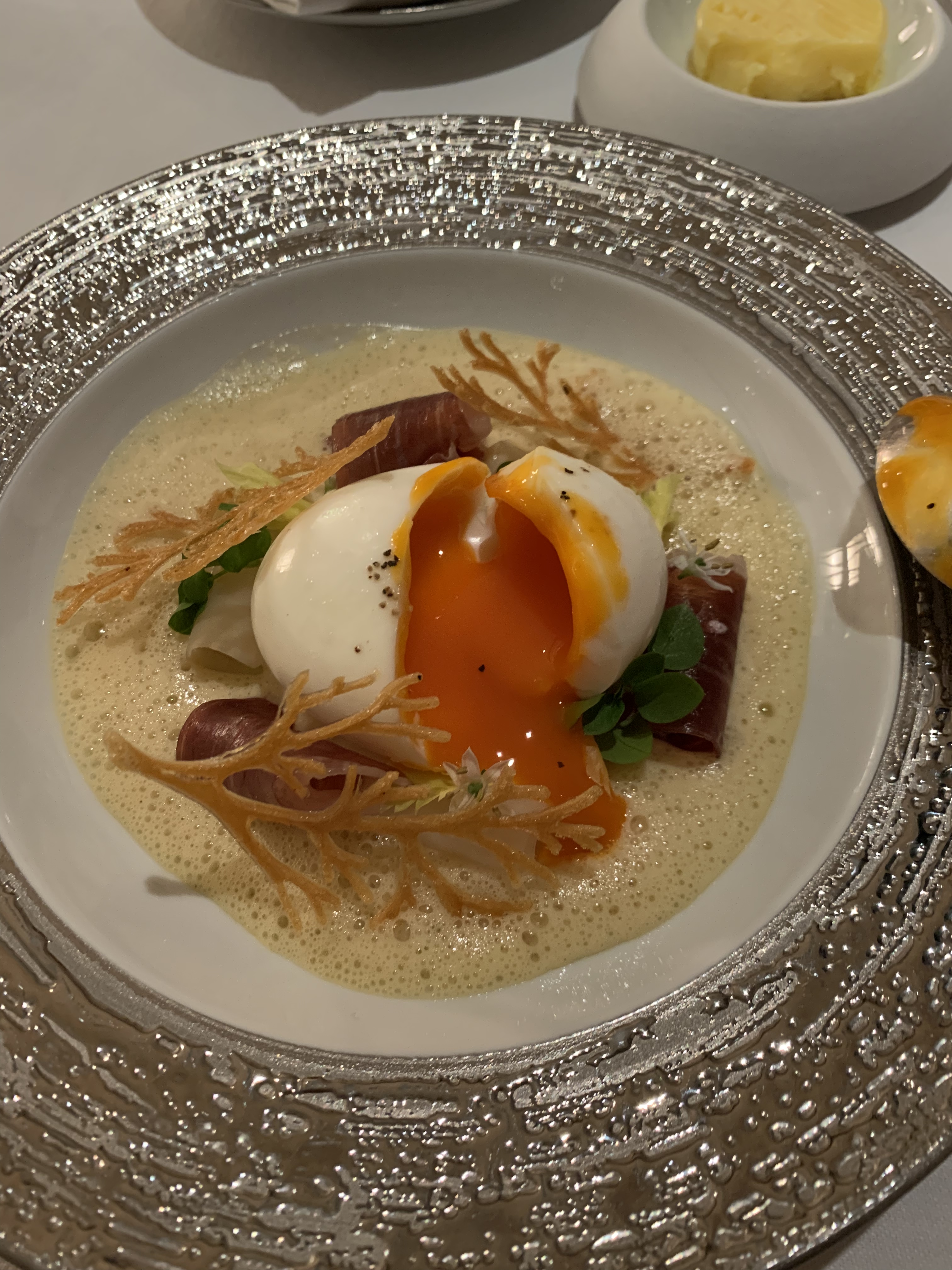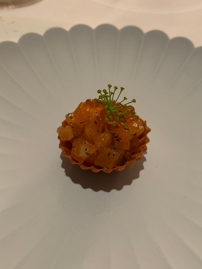 Once seated at the table, there was a welcome letter for us, congratulating us on our wedding. The sommelier came over with a congratulatory glass of champagne and the server shortly after to walk us through the menu. We both opted for the Prestige menu, a multi-course set menu featuring some of Englands most vibrant ingredients. We were then treated to a few amuse bouche to wake up our palates for the incredible meal that we were about to enjoy. There was also complementary homemade bread and home churned butter to go along with it.
