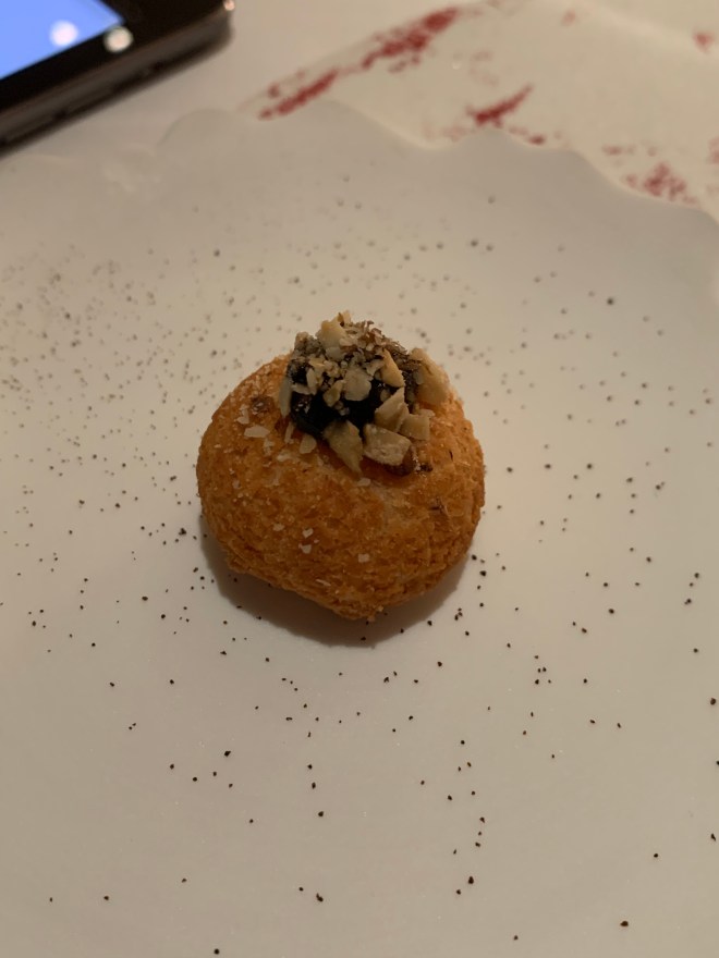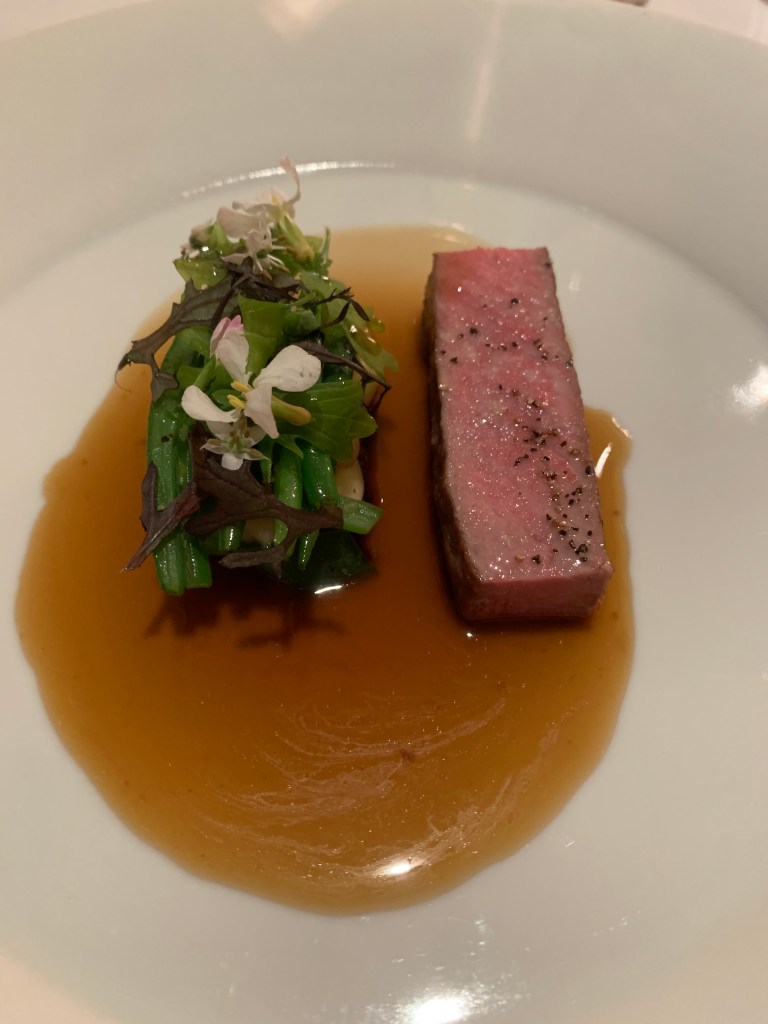 Moving on to the fifth course of the meal, we were presented with a Cornish cod served with violet artichoke, courgette, pine nuts, and Nocellara olives and a lemon and pea sauce over the top. Words cannot describe how absolutely perfectly cooked this cod was. I mean come on now, cod?! Of all the fish out there cod is the one good ol’ Gordon decided to go with? It was perfect. The fish was so flakey, buttery, and moist it just melted in your mouth the second it hit your tongue. The pairs with the fish complimented the flavors without over powering the fish and brought a rustic, earthiness to an otherwise delicate and extremely light dish.