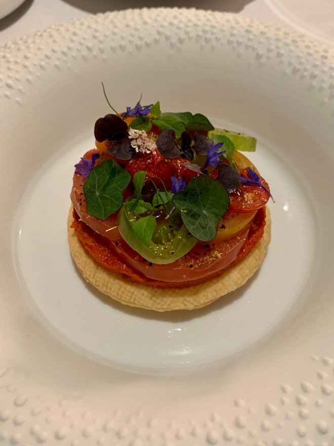 The second course followed up perfectly from the first with a tarte fine; a delicious pillow of puff pastry topped with a luscious and rich romesco sauce, sliced tomatoes from the Isle of Wight, and Rove de Garrigues, and micro greens. The flavors of this hit every area of your mouth. It was salty, savory, sweet, sour, spicy, and just out of this world delicious. My husband is a huge tomato lover and I swear he was happier eating this than he was marrying me, and that’s okay, I understand completely.