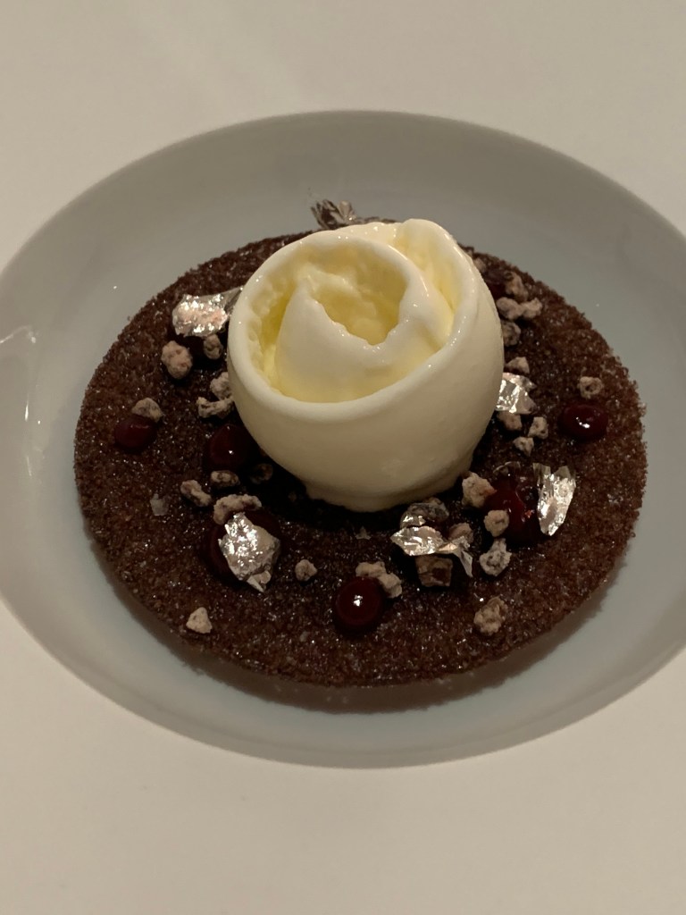 Our second dessert course, course eight was a chocolate lovers dream. The beautiful dessert was a chocolate crémeux with dark cherries, Sakura, and yogurt sorbet. We all know that chocolate, berries, and yogurt go well together but this was on another level. The velvety chocolate crémeux mixed with the sharp tartness of the cherries, the delicate floral flavor of the Sakura, and the tang of the yogurt made this one of the most artfully crafted desserts I’ve ever tried. The on textures and temperatures made this a fun one to eat as well.