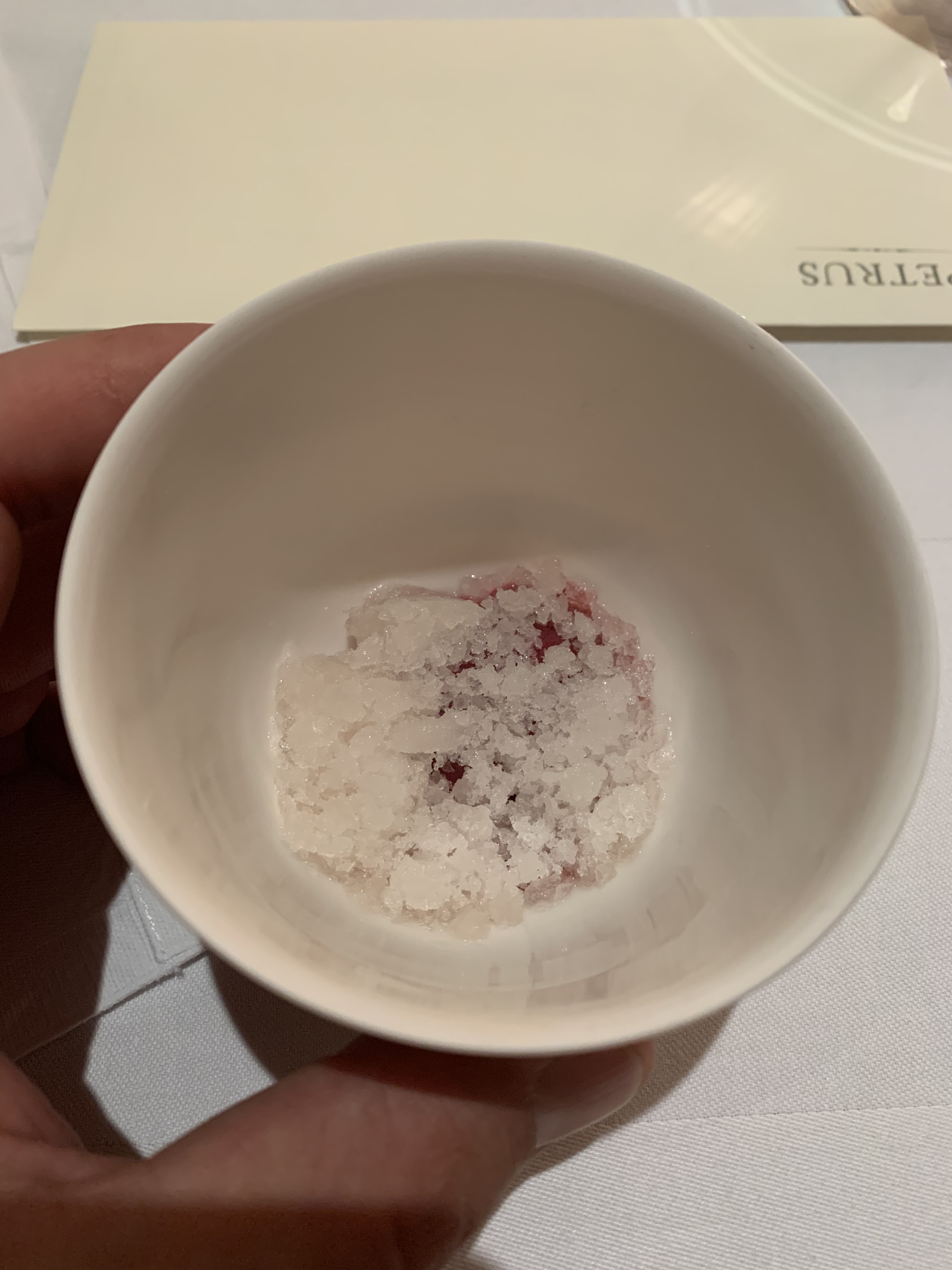 Course seven was a perfect way to reinvigorate our palates and encourage us to continue eating. This course was a sorbet of Fragola grapes and a verjus granite. The cold, slightly sour, slightly sweet flavors brought an excitement right back to the mouth and made us ready for the many desserts yet to come. Small in size, but powerful in flavor. I absolutely loved this dessert.