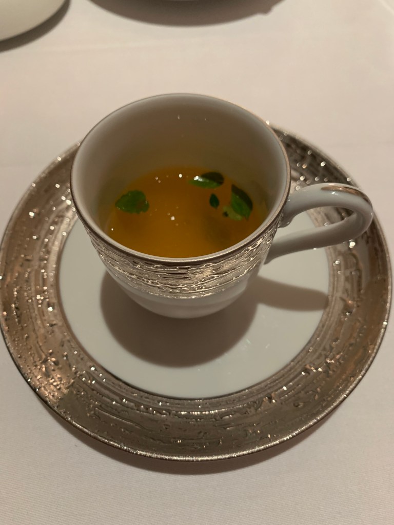 Once we’d finished the amuse bouche we moved on to the actual first course of the meal which presented us with a tomato consumé so packed with flavor it was like biting into a sweet, perfectly roasted tomato and the lemon verbena garnish cut the rich flavor of the broth with an incredibly bright freshness leaving you wanting more and crying when the cup ran out. Serving it in a small tea cup shows is completely ironic to how flavor packed the broth was, which I found to be playful & witty. The course was paired with a bright, effervescent white wine to complement its flavors and Segway us into the next course.