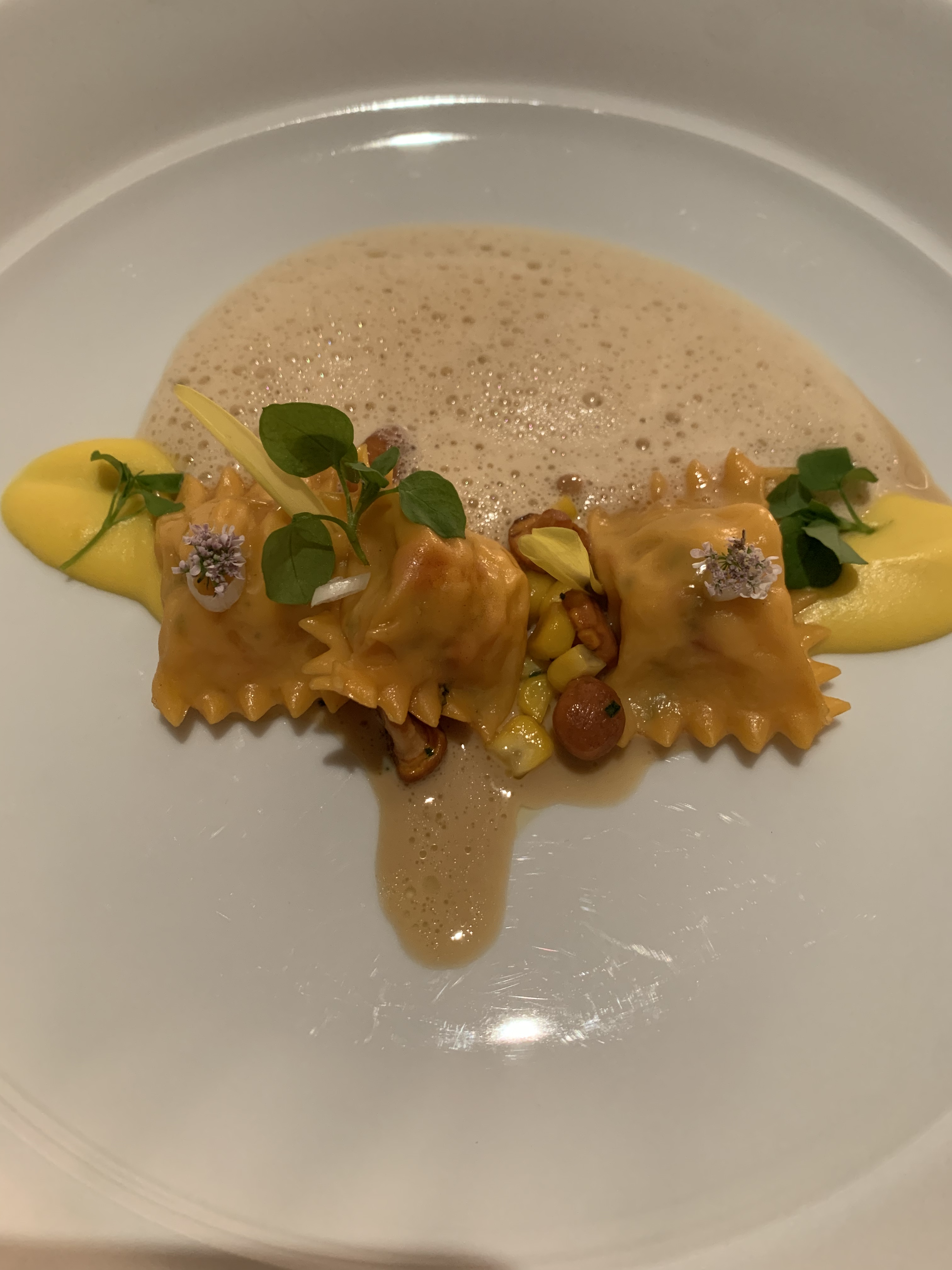 The third course consisted of beautifully crafted envelopes of lobster agnolotti served with delicious sweet corn, girolles mushrooms, and lemon verbena bisque, garnished with micro greens. The flavors of this dish were incredibly delicate and so artfully crafted together and the texture of the agnolotti was sheer perfection.